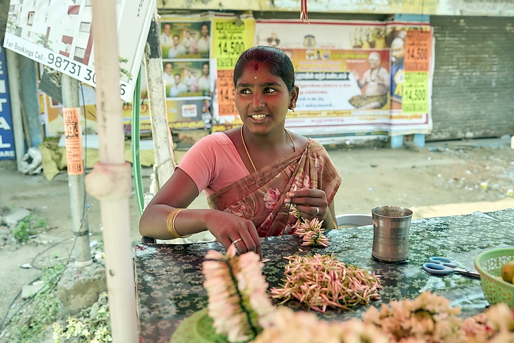 Junge Frau in Madurai. Es ist Tradition in Tamil Nadu, dass junge Frauen an Straßenrändern und auf Märkten Blumenkränze herstellen. Foto: Alexander Paul Englert