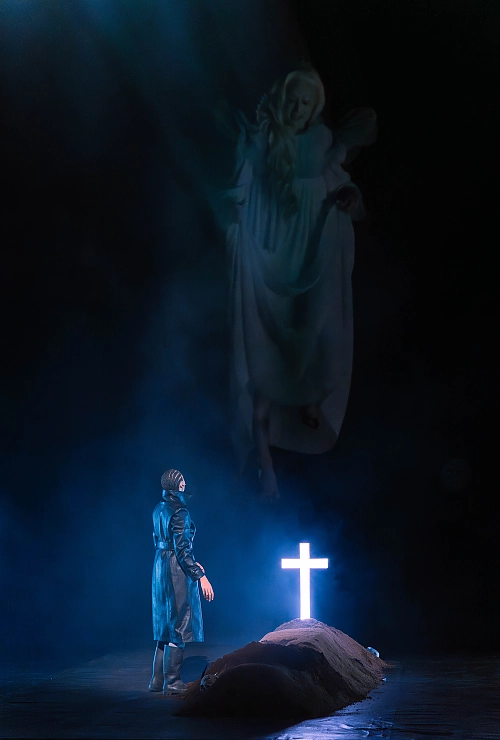Ein Friedhof. Ein Grab. Blitz und Donner, immer wieder. Ein hell leuchtendes, meterhohes Kreuz auf der noch aufgeschütteten Erde. Ein Mann, laut jammernd, wühlt mit seinen Händen in der Erde, wirft sich immer wieder auf das Grab als wolle er, was da begraben liegt, wieder lebendig machen. Ein Vorspiel. Ein Vorgriff.