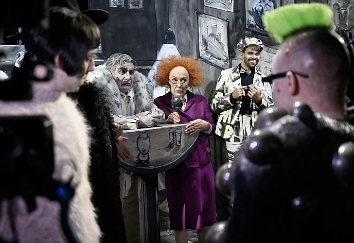 Beim Einlass zur proppevollen Premiere – auch weitere Vorstellungen sind schon ausverkauft – wird der Titel des Stücks auf der Holzwand korrigiert: Der aufhaltsame Aufstieg wird von unsichtbarer Hand laut hörbar durchgestrichen. Warum wird im erwähnten Epilog deutlich, auf den noch zurückzukommen ist. Das Stück zeigt den Untergang einer bürgerlichen Demokratie im Aufstieg eines starken Mannes, dem in seiner ganzen Lächerlichkeit kaum die Errichtung einer Terror-Ordnung zuzutrauen ist, der sich aber mit Lügen und Verstellung, Brandstiftung und Mord den Blumenkohl-Handel nicht nur Chicago (=Deutsches Reich) unterwirft, sondern auch in Cicero (=Österreich) einverleibt. Brechts erklärte Absicht, den „Gröfaz“ lächerlich zu machen, wurde nach dem Weltenbrand und der Shoah als Verharmlosung des Hitler-Faschismus kritisiert. Im Frankfurter Schauspielhaus wurde nach der Pause nur noch selten lauthals gelacht, die Zuschauer merkten mit wachsender Beklommenheit, dass hier auch der offenbar unaufhaltsame Aufstieg eines Donald gespielt wird und, man kann ja gar nichts mehr ausschließen, einer Alice und anderer freundlicher Gesichter des Nationalsozialismus. Die Darsteller ziehen alle Register von Parodie, Travestie und Farce. Dabei kommen einem die Bilder von den „No Kings!“-Massendemonstrationen in amerikanischen Städten in den Sinn, wo sich viele Trump-Gegner in aufblasbare Fantasiekostüme kleideten, worauf das Weiße Haus mit einer KI-generierten Selbstkrönung zum Monarchen reagierte und der Farce noch eines draufsetzte. Spielt ihr nur Aufstand, ich mache ernst!