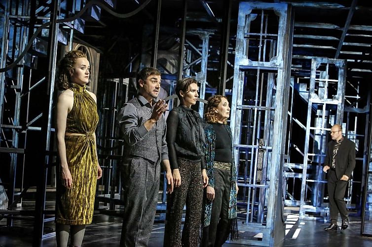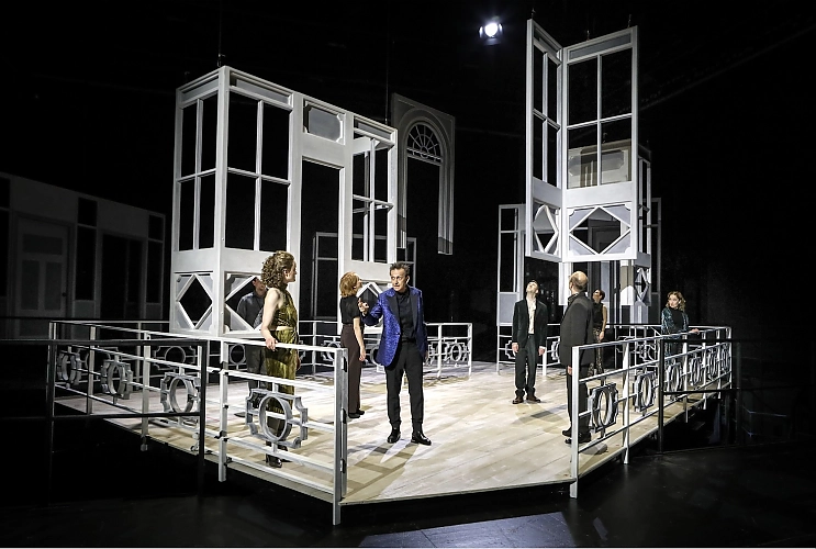 Das Bühnenbild, tatsächlich konzipiert für den Niedergang einer ganzen Branche, Kohle-Stahl, vermutlich an Thyssen-Hoesch, im Ruhrpott orientiert. Eine reine, nach allen Seiten, in allen ihren Einzelelementen offene Stahlkonstruktion. Tief in den Bühnenboden, hoch in den Bühnenhimmel. Es steigt ein sowohl versenkbares wie auffahrbares Stahlgerüst mit freibaumelnden, nach allen Seiten offenen, weiß lackierten Einzelelementen, von ganz unten bis nach ganz oben. Stahl und offene, dadurch durchsichtige Rahmen, allerdings wie im Rohbau. Was das mit dem Niedergang des Handelskapitals im Übergang zum Industriekapital, im konkreten Fall mit dem Niedergang des Handelshauses Johann Buddenbrook & Nachfolger und dem Aufsteigen des den Umbruch-Zeiten besser angepassten Hauses Hagenström zu tun haben soll, das bleibt das Geheimnis der Regie und des Bühnenbildners Daniel Wollenzin. Sein Bühnenbild ist von der Geschichte der Buddenbrooks deutlich weiter entfernt als, sagen wir, Duisburg von der Hansestadt Lübeck. Sei`s drum.
