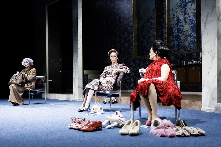 Die drei Frauen leben allesamt aus & von ihrer Vergangenheit. Margot wird von Manja Kuhl mit kühler Distanz als politische Größe aus eigener Macht präsentiert. Sie strahlt Selbstgewissheit bis zur Arroganz aus. Und sie demonstriert die Kühle, ja Kälte, die man ihrer Vorlage nachsagte. Deshalb beansprucht sie nicht ganz zu Unrecht eine führende Rolle in diesem Trio. Sie demonstriert immer wieder ihre Überlegenheit gegenüber den beiden Diktatoren-Frauen, beide glaubhaft präsentiert von Melanie Straub und Christina Geiße. Beide haben parasitär von der Macht ihrer Männer gelebt und bringen das auch jetzt auf der Bühne deutlich zum Ausdruck. Margot dagegen glaubt nach wie vor, auf der richtigen Seite der Geschichte zu stehen. Und glaubt zudem, dass ihre Zeit noch, das meint: wieder, kommen wird. Die beiden anderen Damen leben gleichsam nur in der Vergangenheit.