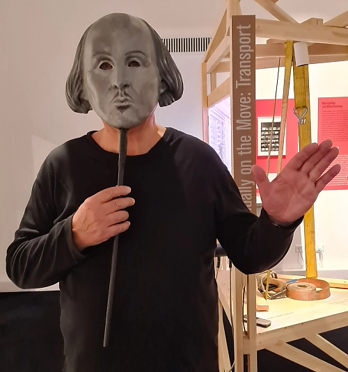 Die Ausstellung fragt, was die Theaterwelt bewegt, heute, vor 50 oder 100 Jahren, zeigt dazu Highlights aus den historischen Sammlungen des Deutschen Theatermuseums, und fordert uns auf, über die Zukunft des Theaters nachzudenken und darüber zu sprechen. Und eröffnet Möglichkeiten – für Ausstellungen eher ungewöhnlich - einige der Ausstellungsstücke in die Hand zu nehmen, daran zu riechen, zu lesen oder damit zu spielen – beispielsweise mit handgefertigten Shakespeare Masken.