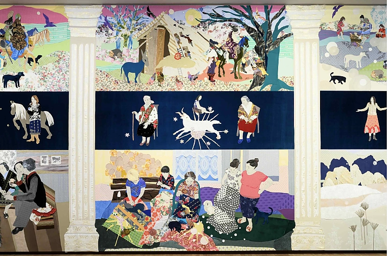 Małgorzata Mirga-Tas’ Fokus liegt dabei auf dem Leben von Rom*nja-Gemeinschaften, der größten ethnischen Minderheit unseres Kontinents, wobei sie in ihren Werken besonders die Perspektive der Frauen hervorhebt. Durch die bildmächtige Kombination verschiedener Textilien und Muster schafft sie ein intimes Bild vom Alltag der Rom*nja – oft verknüpft mit historischen Narrativen.