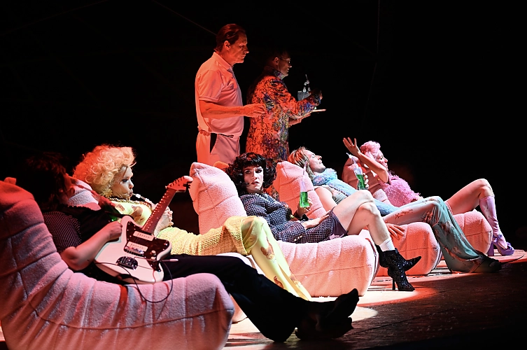 Lio Laksch, souverän von Lotte Schubert präsentiert, plant einen Aufenthalt von einer Woche, aber verfällt, ähnlich wie einst Hans Castorp im „Zauberberg“, schon bald der kaum erklärlichen Faszination des Sanatoriums. Die, man möchte sagen, Insassen, tatsächlich Wohlstandsopfer, die nicht nur an ihrem Reichtum, sondern auch an der immer deutlicher werdenden Sichtbarkeit der Endlichkeit ihres Daseins leiden, den Falten, Flecken, Wülsten, Hängebrüsten, diese Ansammlung von schrägen Gestalten, darunter ein Opernsänger, der seine Stimme verloren hat und dem zeitweise auch noch seine Frau, eine, wie es bildschön heißt, „Make-up-Influencerin, abhanden kommt, dieses Panoptikum verspricht sich Hilfe von dem wunderbar/ sonderbar verrückten Anstaltsarzt namens Dr. Klotz. Dieser Arzt, eine Art Volksausgabe des Doktor Faustus, wird von Wolfram Koch, dem Dreh- und Angelpunkt des Stücks, mal in kurzer Turnhose, mal im abwaschbaren Arztkittel in seiner ganzen Verrücktheit (und Verzücktheit) auf die Bühne gebracht. Dr. Klotz behandelt seine Patienten nicht nur mit dubiosen Injektionen. Er betätigt sich vor allem als Forscher. Sein Spezialgebiet: „Nacktmullen“, das sind die seltsamen Viecher, die, blind, in regelrechten Kolonien, Kompaniestärke, tief unter der Erde leben. Sie haben kein Fell. Nur ihre Lippen sind behaart. Ihre rosige, faltige Haut umgibt sie wie eine locker sitzende Umhüllung. Aufgrund solcher und anderer Eigenschaften verspricht sich Dr. Klotz von ihnen, gleich zwei Rätsel lösen zu können: das ewige Leben und eine Art Jungbrunnen, also eine Restitution von Altersprozessen. Der Mann ist also ein Spinner. Aber seine Patienten glauben an ihn. Und der Herr Anton ebenso. Die Rolle des Dieners, stets gehorsam, nach oben buckelnd, nach unten tretend, was sich bei der Ankunft von Lio Laksch gleich zeigt, wird von Christoph Pütthoff voll ausgefüllt.