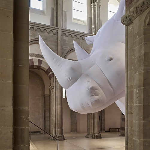 Die Installation eines überlebensgroßen Rhinozeros füllt den gesamten Kirchenraum und versperrt den Blick auf die romanische Architektur. Aus allen Himmelsrichtungen erklingt Musik. Der in Berlin lebende israelisch/deutsche Künstler Itamar Gov hat die gewaltige interdisziplinäre Installation für den mittelalterlichen Kirchenraum im Kunstmuseum Magdeburg geschaffen.