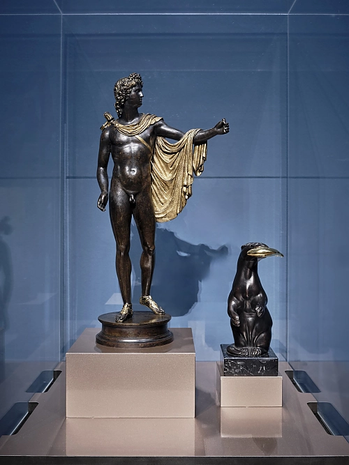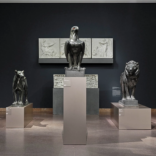 August Gaul markiert den Beginn der modernen Plastik in Deutschland. Mit seinen Tierdarstellungen befreit er das Motiv von jahrhundertealter Symbolik und entwickelt eine neue bildhauerische Formensprache, die weit ins 20. Jahrhundert hineinwirkt. Die Ausstellung lädt dazu ein, Gauls Modernität anhand von rund hundert Werken aus Bronze, Keramik und Marmor zu entdecken. Neben eindrucksvollen, lebensgroßen Skulpturen von Löwen und Menschenaffen richtet Gaul den Blick auch auf Tiere, die zuvor in der Kunst kaum Beachtung fanden, wie etwa Esel, Gänse oder Enten. Erstmals und fast vollständig zeigt die Ausstellung die bedeutende Frankfurter Privatsammlung von Carlo Giersch und wird durch zahlreiche Leihgaben aus Berlin, Hamburg, Hanau und Leipzig ergänzt. Die Präsentation erstreckt sich über fast alle Bereiche des Liebieghauses und setzt Gauls Werk in einen facettenreichen Dialog mit der Sammlung. Ein besonderer Höhepunkt ist der überlebensgroße Adler im Museumsgarten, den der Künstler ursprünglich für das Kaiser-Wilhelm-Nationaldenkmal in Berlin schuf. Anders als die traditionellen heroischen Darstellungen ist der Vogel hier im Landeanflug auf sein Nest zu sehen – ein eindrucksvolles Beispiel für Gauls künstlerisches Programm, das natürliche Verhalten des Tieres an Stelle seiner politischen Symbolik zu setzen. Seine Arbeit knüpft dabei an zeitgenössische naturwissenschaftliche und tierpsychologische Forschungen, etwa von Charles Darwin, an. Besonders deutlich wird dies in der Gegenüberstellung von Gauls Porträt Orang-Utan-Kopf „Jumbo“ (1895) mit einem antiken Bildnis des römischen Kaisers und Philosophen Marc Aurel (nach 169 n. Chr.).