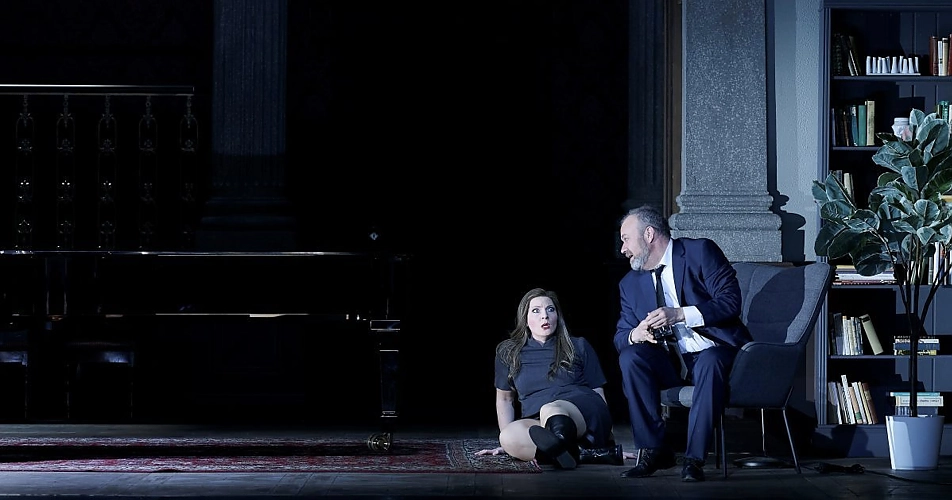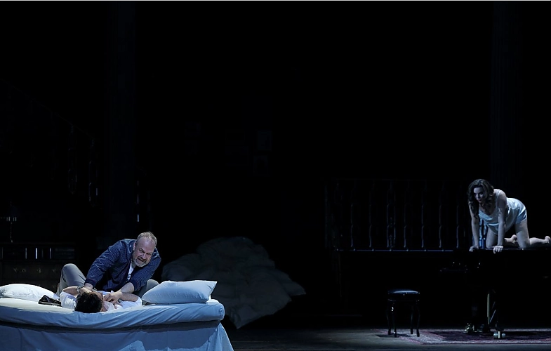 Nach der Pause dann „Eine Florentinische Tragödie“ von Alexander Zemlinsky. Uraufgeführt 1917 in Stuttgart stammt die Komposition also aus der gleichen Zeit wie die Bartóks, ist jedoch völlig anders. Letzterer bereits in der musikalischen Moderne angekommen, ist Zemlinsky in der Hoch- respektive Spätromantik stecken geblieben, webt ausziselierte, elegante Klangteppiche und verlässt nie die den Boden der Tonalität. Das Libretto basiert auf der Dichtung von Oscar Wide „A Florentine Tragedy“. Der Inhalt: Der Tuchhändler Simone (Johan Reuter) kehrt nach einer Geschäftsreise nachhause zurück und erwischt seine Ehefrau Bianca (Sopran Ambur Braid) im Bett mit ihrem Liebhaber Guido (Tenor Thomas Blondelle). Das lässt ihn anscheinend zunächst völlig kalt und er behandelt Guido wie einen willkommenen Stoff-Kunden in seinem Haus. Als dieser ihn ziemlich arrogant wissen lässt, dass ihn nicht die Stoffe, sondern nur Ehefrau Bianca interessieren, kommt es zum Streit und zum Kampf. Bianca stachelt Guido an, ihren Mann umzubringen. Doch Simone ist der Stärkere, Guido stirbt. Schauplatz ist zum dritten Mal der bereits bekannte Salon in moderner Version. Diesmal ein großes Bett im Vordergrund. Während des Kampfes hockt Bianca in Unterwäsche auf dem Flügel und schaut zu, wie ihr Liebhaber umgebracht wird. Interessant war rein musikalisch gesehen die Gegenüberstellung zwei so unterschiedlicher Kompositionen aus der gleichen Zeit. Sehr witzig die vor- und zwischengeschalteten Videos über den „modernen Mann“. Nicht eröffnet hat sich mit hingegen der von der Regie als überzeitlich angedachte Zusammenhang der Frauenrolle.