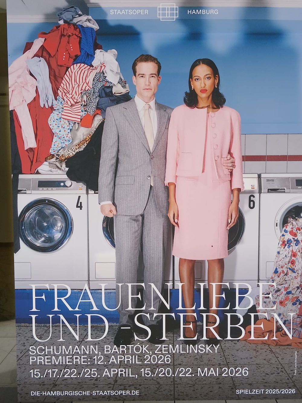 Der Logik der Inszenierung entsprechend stirbt im letzten Lied die Frau im x-ten Kindbett (nicht der Mann, wie im Originaltext!) und ihr Sarg wird während des Klaviernachspiels von einem großen Trauerzug begleitet aus dem Salon getragen, um im selben Salon, jetzt aber modern möbliert, zu landen. Die augenfällige Aussage: Das Schicksal der Frauen hat sich bis heute nicht geändert. Und tatsächlich haben sie ja noch immer unter männlicher Gewalt und Herrschaft in unterschiedlichster Ausprägung zu leiden, die allerdings inzwischen zumindest offiziell verpönt ist und endlich auch von Frauen angeprangert wird; jüngste, öffentlich breit diskutierte Beispiele Fernandez und Pelicot. Dennoch passierten 2024 laut statista.de 299 Tötungsdelikte an Frauen (gegenüber 369 an Männern), wobei die Tendenz im Vergleich zu den Vorjahren nach unten zeigt. Gleichgeblieben ist aber die Tatsache, dass Frauenmorde so gut wie immer von Männern und diese aus dem persönlichen Umfeld stammend, begangen werden. Frauen morden nur in absoluten Ausnahmefällen.